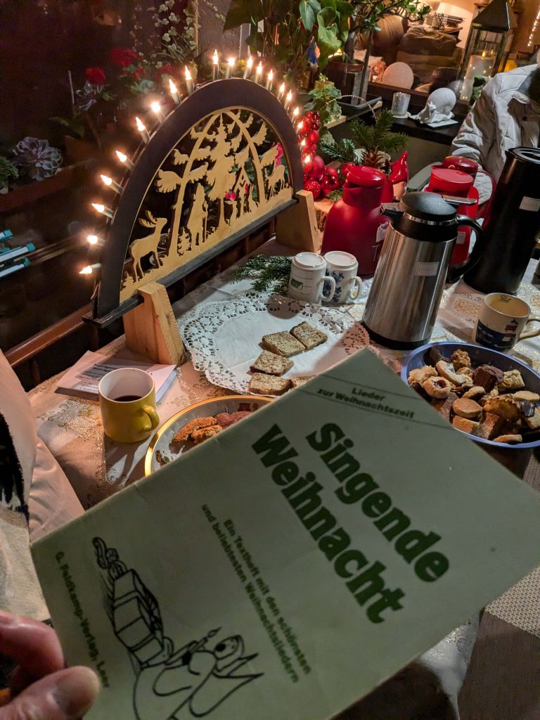 Viel mehr gehört nicht dazu, Gastgeberin oder Gastgeber beim „Lebendigen Adventskalender“ zu sein; üblicher Weise wird den Gästen ein heißer Tee und ein paar (weihnachtliche) Kekse gereicht. bei der Auswahl von etwa zwei adventlichen Liedern und lustigen bzw. spannenden Weihnachtsgeschichten wären wir auch gern behilflich, sollten Sie dazu Anregungen benötigen.(Nebenbei: Becher für Tee bringen die Gäste in der Regel mit; Thermo-Kannen stellen wir zur Verfügung – ebenso gut geeignete Liederbücher.)