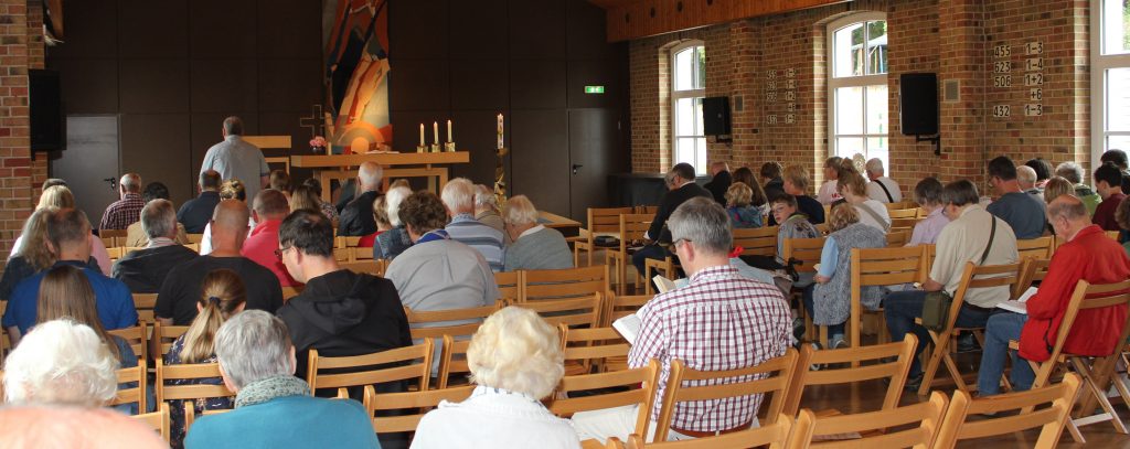 Die Gastgeber unter der Leitung der Vorsitzenden des Kirchenvorstands, Isolde Kirchberg, hatten alle Vorbereitungen für eine fröhliche Feier unter freiem Himmel getroffen. Kurz nach dem Ende des einleitenden Gottesdienstes durch Pastor Jens Fortmann fing es allerdings zunehmend an zu regnen. Schnell wurde den Veranstaltern klar: wir müssen umziehen. Soll heißen, alle draußen aufgestellten Tische und Bänke sowie die Musikveranstaltungen mussten spontan ins Gebäude verlegt werden.