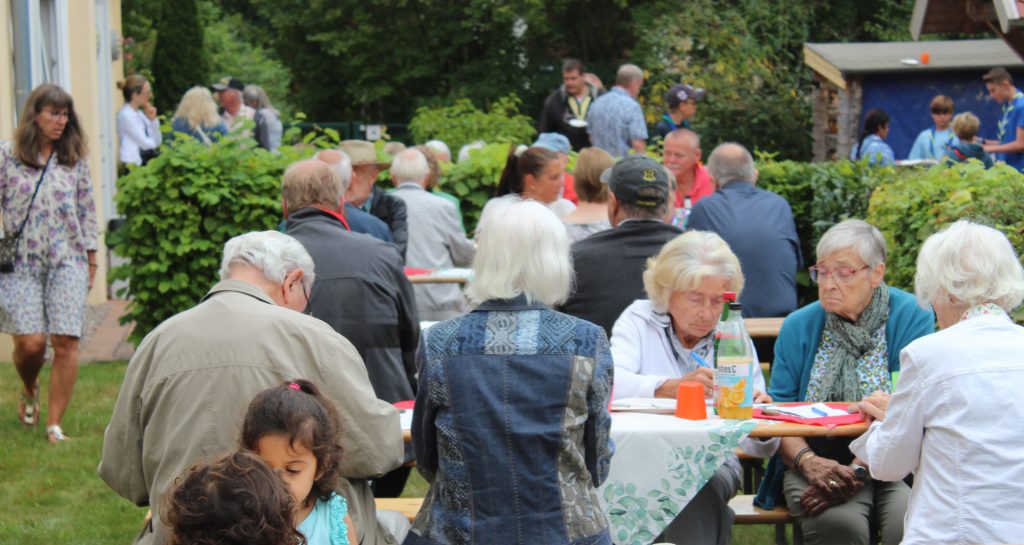 Das tat jedoch der Stimmung keinen Abbruch. Auch drinnen schmeckte der hausgemachte Kuchen und leckeren Salate sowie die von den Pfadfindern zubereiteten Bratwürste. Bemerkenswert war die Vielfalt der in der Kirchengemeinde aktiven Gruppen, die sich einzeln vorstellten. Parallel dazu hatten die Kita „Paul Gerhardt“ und die Pfadfinder „Kreuzfähnlein“ den jüngeren Gäste ein abwechslungsreiches Spielprogramm angeboten.